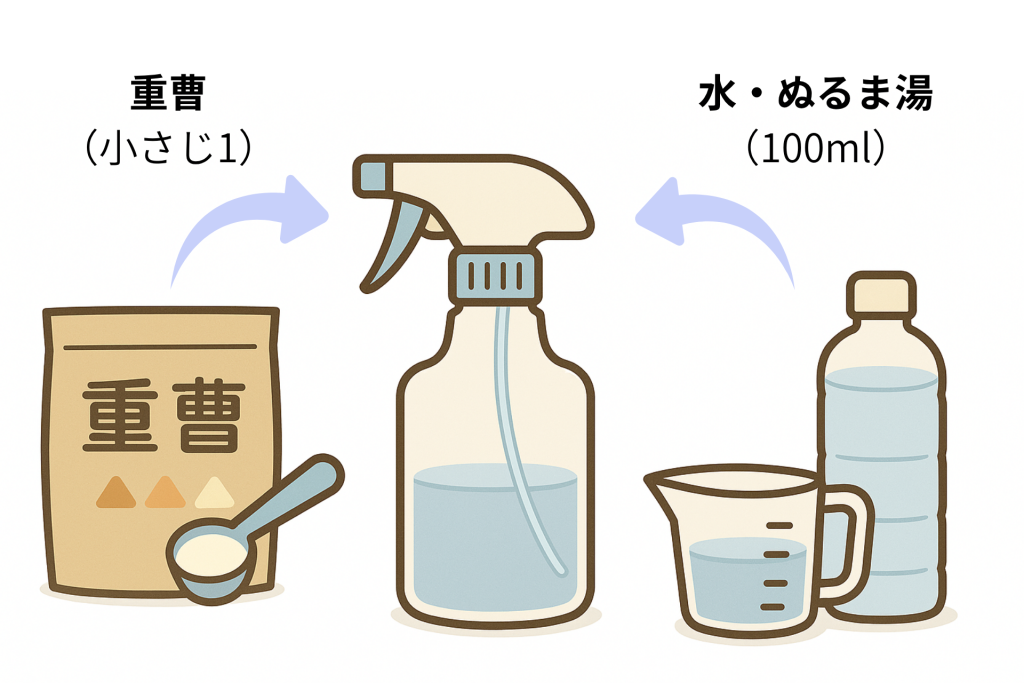 水500mlに重曹小さじ1程度の割合で混ぜた重曹水をスプレーボトルに入れ、汚れた箇所にスプレーしてタオルで拭き取って掃除するほか、おう吐物がついた場所(カーペット、ソファなど)に重曹を厚めに振りかけ、数時間置いてから掃除機で吸い取る方法があります。