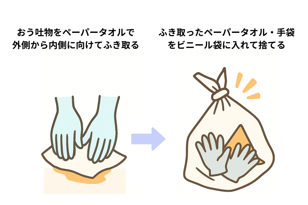 - おう吐物はペーパータオルなどで取り除き、ビニール袋に入れる