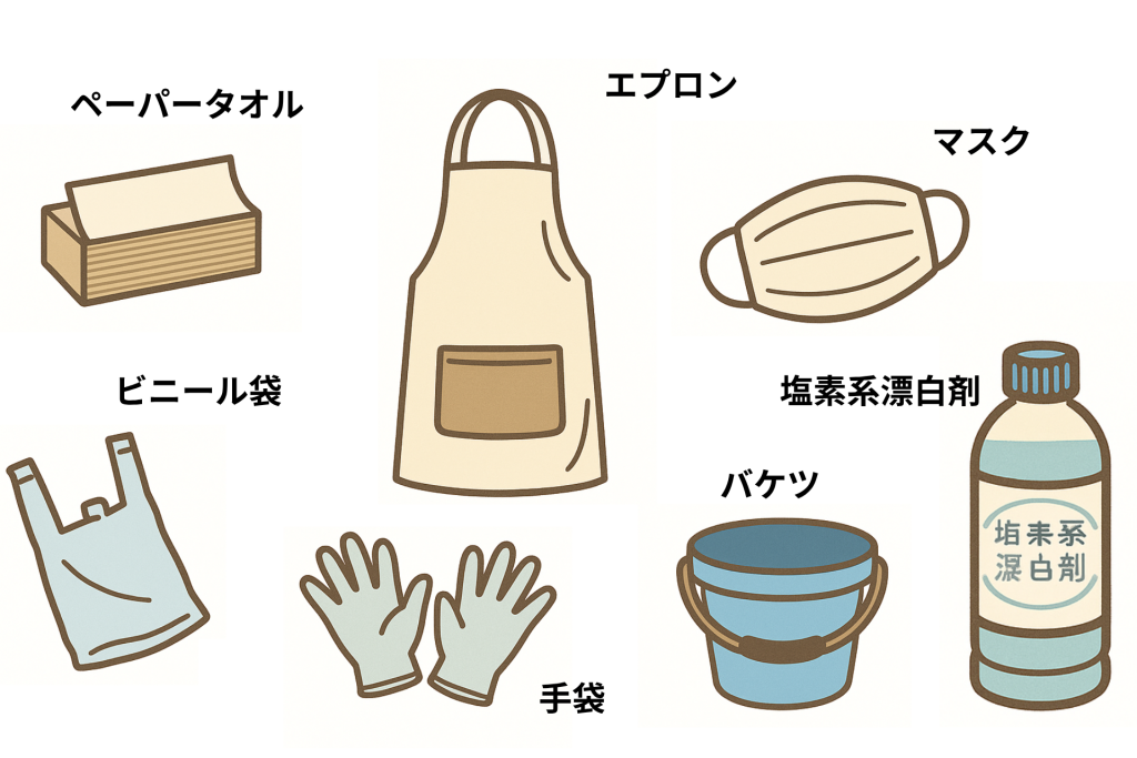 - 換気のために窓を開け、手袋・マスク・エプロンをつける
