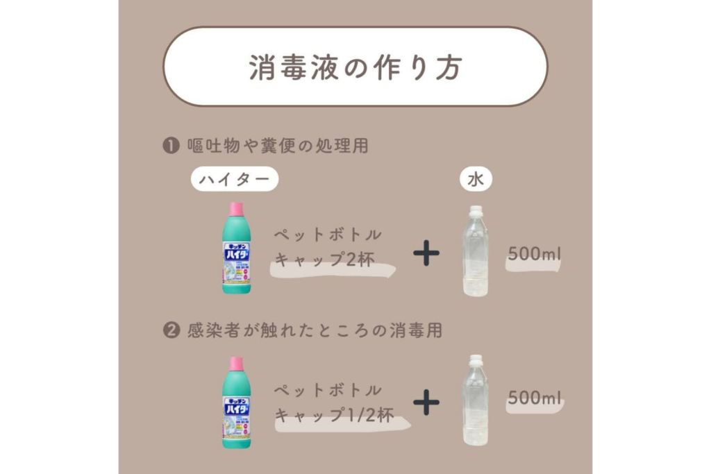 ※ウイルス性胃腸炎の消毒にアルコールは効果がないため、塩素系漂白剤で作成した消毒液か熱湯で消毒が必要です。
