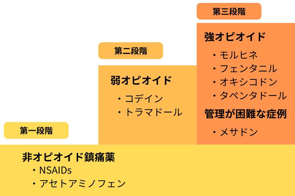 疼痛ラダーは痛みの変化に合わせて治療を見直すための指標として、階段の構造で整理されています。